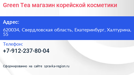 Green Tea, магазин корейской косметики по адресу 620034, Свердловская область, Екатеринбург, Халтурина, 55 в дальнейшем Организация, размещена в следующих категориях: