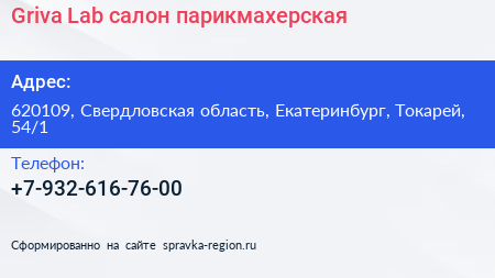Griva Lab, салон-парикмахерская по адресу 620109, Свердловская область, Екатеринбург, Токарей, 54/1 в дальнейшем Организация, размещена в следующих категориях: