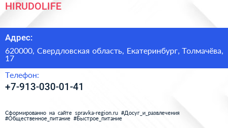 HIRUDOLIFE по адресу 620000, Свердловская область, Екатеринбург, Толмачёва, 17 в дальнейшем Организация, размещена в следующих категориях: