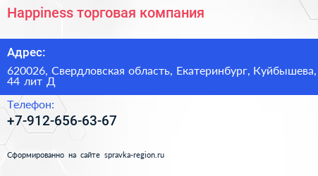 Happiness, торговая компания по адресу 620026, Свердловская область, Екатеринбург, Куйбышева, 44 лит Д в дальнейшем Организация, размещена в следующих категориях: