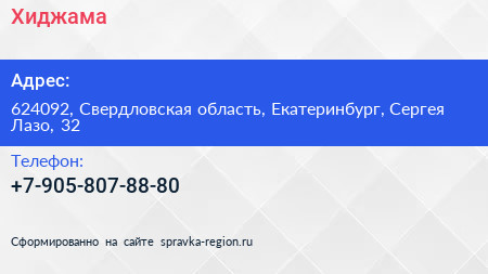 Хиджама по адресу 624092, Свердловская область, Екатеринбург, Сергея Лазо, 32 в дальнейшем Организация, размещена в следующих категориях: