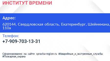 ИНСТИТУТ ВРЕМЕНИ по адресу 620144, Свердловская область, Екатеринбург, Шейнкмана, 110а в дальнейшем Организация, размещена в следующих категориях: