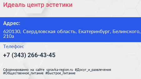 Идеаль, центр эстетики по адресу 620130, Свердловская область, Екатеринбург, Белинского, 210а в дальнейшем Организация, размещена в следующих категориях:
