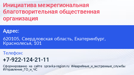 Инициатива, межрегиональная благотворительная общественная организация по адресу 620105, Свердловская область, Екатеринбург, Краснолесья, 101 в дальнейшем Организация, размещена в следующих категориях: