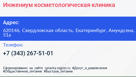 Инжениум, косметологическая клиника по адресу 620146, Свердловская область, Екатеринбург, Амундсена, 51а в дальнейшем Организация, размещена в следующих категориях: