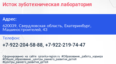 Исток, зуботехническая лаборатория по адресу 620039, Свердловская область, Екатеринбург, Машиностроителей, 43 в дальнейшем Организация, размещена в следующих категориях:
