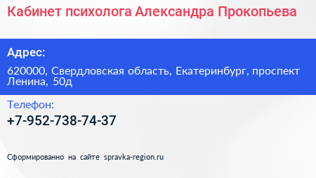 Кабинет психолога Александра Прокопьева по адресу 620000, Свердловская область, Екатеринбург, проспект Ленина, 50д в дальнейшем Организация, размещена в следующих категориях: