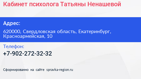 Кабинет психолога Татьяны Ненашевой по адресу 620000, Свердловская область, Екатеринбург, Красноармейская, 10 в дальнейшем Организация, размещена в следующих категориях: