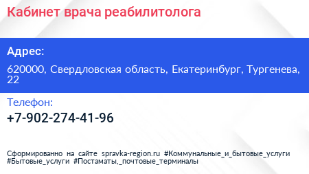 Кабинет врача-реабилитолога по адресу 620000, Свердловская область, Екатеринбург, Тургенева, 22 в дальнейшем Организация, размещена в следующих категориях: