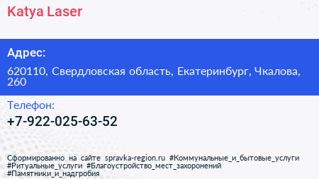 Katya Laser по адресу 620110, Свердловская область, Екатеринбург, Чкалова, 260 в дальнейшем Организация, размещена в следующих категориях: