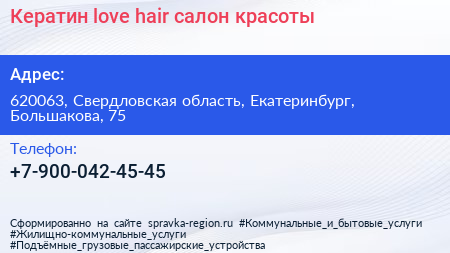 Кератин love hair, салон красоты по адресу 620063, Свердловская область, Екатеринбург, Большакова, 75 в дальнейшем Организация, размещена в следующих категориях: