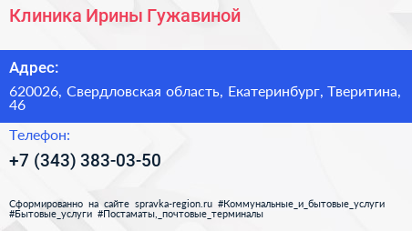 Клиника Ирины Гужавиной по адресу 620026, Свердловская область, Екатеринбург, Тверитина, 46 в дальнейшем Организация, размещена в следующих категориях: