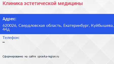 Клиника эстетической медицины по адресу 620026, Свердловская область, Екатеринбург, Куйбышева, 44д в дальнейшем Организация, размещена в следующих категориях: