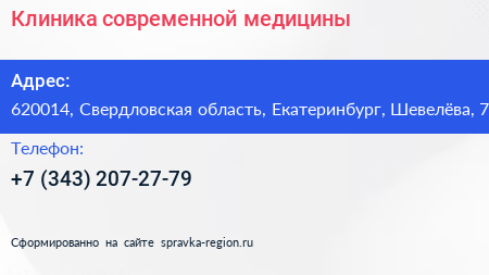 Клиника современной медицины по адресу 620014, Свердловская область, Екатеринбург, Шевелёва, 7 в дальнейшем Организация, размещена в следующих категориях: