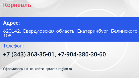 Корнеаль по адресу 620142, Свердловская область, Екатеринбург, Белинского, 108 в дальнейшем Организация, размещена в следующих категориях: