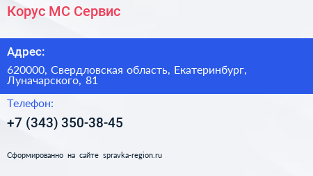 Корус МС-Сервис по адресу 620000, Свердловская область, Екатеринбург, Луначарского, 81 в дальнейшем Организация, размещена в следующих категориях: