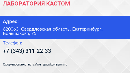 ЛАБОРАТОРИЯ КАСТОМ по адресу 620063, Свердловская область, Екатеринбург, Большакова, 75 в дальнейшем Организация, размещена в следующих категориях: