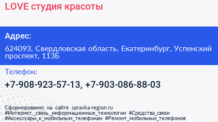 LOVE, студия красоты по адресу 624093, Свердловская область, Екатеринбург, Успенский проспект, 113Б в дальнейшем Организация, размещена в следующих категориях: