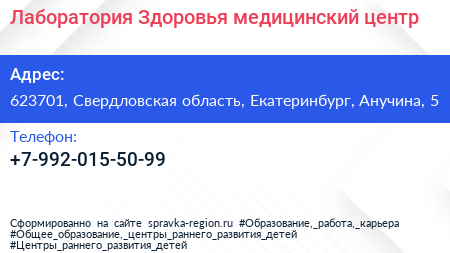 Лаборатория Здоровья, медицинский центр по адресу 623701, Свердловская область, Екатеринбург, Анучина, 5 в дальнейшем Организация, размещена в следующих категориях: