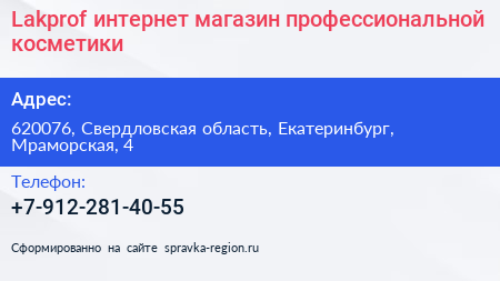 Lakprof, интернет-магазин профессиональной косметики по адресу 620076, Свердловская область, Екатеринбург, Мраморская, 4 в дальнейшем Организация, размещена в следующих категориях: