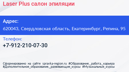 Laser Plus, салон эпиляции по адресу 620043, Свердловская область, Екатеринбург, Репина, 95 в дальнейшем Организация, размещена в следующих категориях: