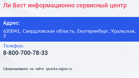 Ли Вест, информационно-сервисный центр по адресу 620041, Свердловская область, Екатеринбург, Уральская, 3 в дальнейшем Организация, размещена в следующих категориях: