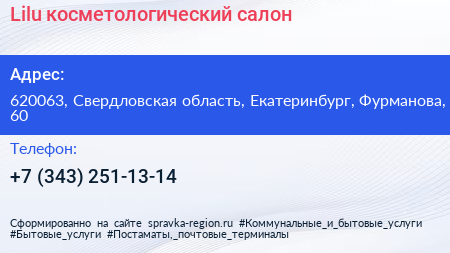 Lilu, косметологический салон по адресу 620063, Свердловская область, Екатеринбург, Фурманова, 60 в дальнейшем Организация, размещена в следующих категориях:
