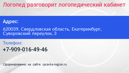 Логопед разговорит, логопедический кабинет по адресу 620039, Свердловская область, Екатеринбург, Суворовский переулок, 3 в дальнейшем Организация, размещена в следующих категориях: