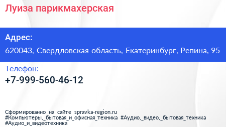 Луиза, парикмахерская по адресу 620043, Свердловская область, Екатеринбург, Репина, 95 в дальнейшем Организация, размещена в следующих категориях: