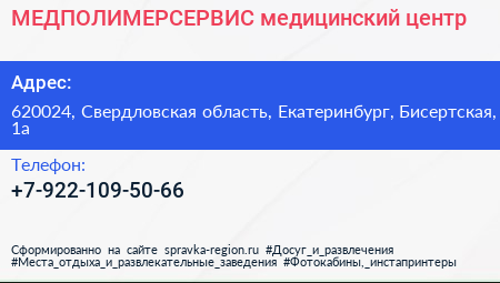 МЕДПОЛИМЕРСЕРВИС, медицинский центр по адресу 620024, Свердловская область, Екатеринбург, Бисертская, 1а в дальнейшем Организация, размещена в следующих категориях: