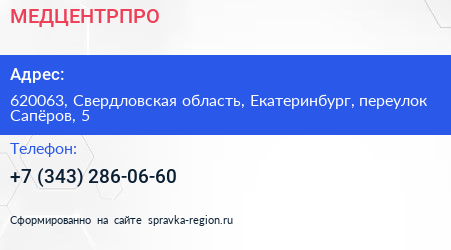 МЕДЦЕНТРПРО по адресу 620063, Свердловская область, Екатеринбург, переулок Сапёров, 5 в дальнейшем Организация, размещена в следующих категориях: