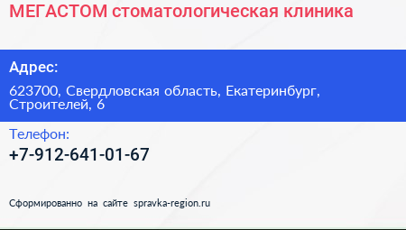 МЕГАСТОМ, стоматологическая клиника по адресу 623700, Свердловская область, Екатеринбург, Строителей, 6 в дальнейшем Организация, размещена в следующих категориях: