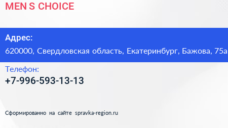MEN`S CHOICE по адресу 620000, Свердловская область, Екатеринбург, Бажова, 75а в дальнейшем Организация, размещена в следующих категориях:
