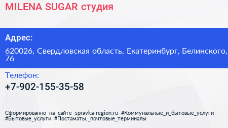 MILENA SUGAR, студия по адресу 620026, Свердловская область, Екатеринбург, Белинского, 76 в дальнейшем Организация, размещена в следующих категориях: