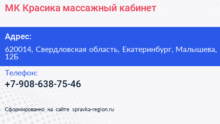 МК Красика, массажный кабинет по адресу 620014, Свердловская область, Екатеринбург, Малышева, 12Б в дальнейшем Организация, размещена в следующих категориях: