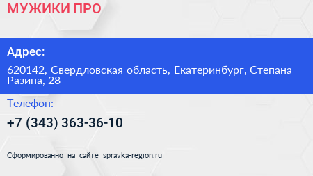 МУЖИКИ ПРО по адресу 620142, Свердловская область, Екатеринбург, Степана Разина, 28 в дальнейшем Организация, размещена в следующих категориях: