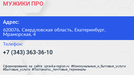 МУЖИКИ ПРО по адресу 620076, Свердловская область, Екатеринбург, Мраморская, 4 в дальнейшем Организация, размещена в следующих категориях: