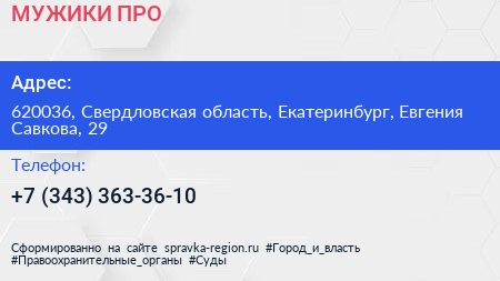 МУЖИКИ ПРО по адресу 620036, Свердловская область, Екатеринбург, Евгения Савкова, 29 в дальнейшем Организация, размещена в следующих категориях: