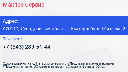 Макпро Сервис по адресу 620110, Свердловская область, Екатеринбург, Михеева, 2 в дальнейшем Организация, размещена в следующих категориях: