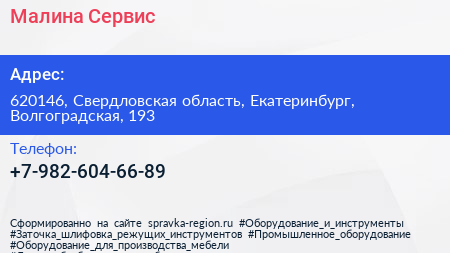 Малина Сервис по адресу 620146, Свердловская область, Екатеринбург, Волгоградская, 193 в дальнейшем Организация, размещена в следующих категориях: