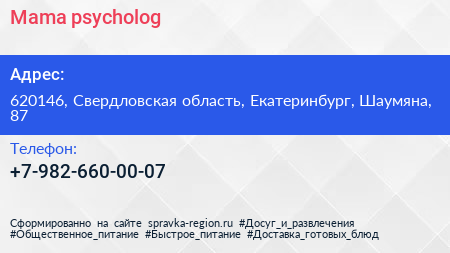 Mama psycholog по адресу 620146, Свердловская область, Екатеринбург, Шаумяна, 87 в дальнейшем Организация, размещена в следующих категориях: