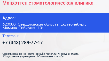 Манхэттен, стоматологическая клиника по адресу 620000, Свердловская область, Екатеринбург, Мамина-Сибиряка, 101 в дальнейшем Организация, размещена в следующих категориях: