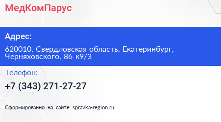 МедКомПарус по адресу 620010, Свердловская область, Екатеринбург, Черняховского, 86 к9/3 в дальнейшем Организация, размещена в следующих категориях: