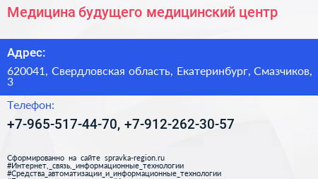 Медицина будущего, медицинский центр по адресу 620041, Свердловская область, Екатеринбург, Смазчиков, 3 в дальнейшем Организация, размещена в следующих категориях: