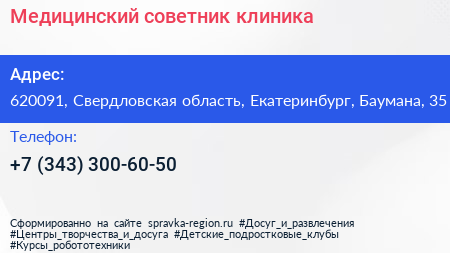 Медицинский советник, клиника по адресу 620091, Свердловская область, Екатеринбург, Баумана, 35 в дальнейшем Организация, размещена в следующих категориях: