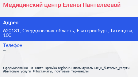 Медицинский центр Елены Пантелеевой по адресу 620131, Свердловская область, Екатеринбург, Татищева, 100 в дальнейшем Организация, размещена в следующих категориях: