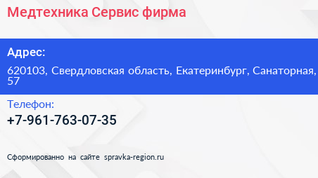 Медтехника-Сервис, фирма по адресу 620103, Свердловская область, Екатеринбург, Санаторная, 57 в дальнейшем Организация, размещена в следующих категориях: