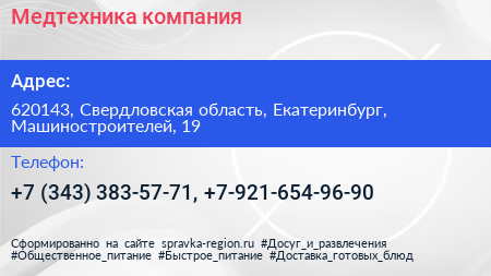 Медтехника, компания по адресу 620143, Свердловская область, Екатеринбург, Машиностроителей, 19 в дальнейшем Организация, размещена в следующих категориях: