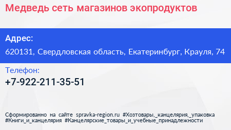 Медведь, сеть магазинов экопродуктов по адресу 620131, Свердловская область, Екатеринбург, Крауля, 74 в дальнейшем Организация, размещена в следующих категориях: