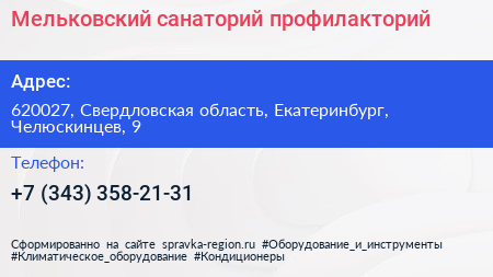 Мельковский, санаторий-профилакторий по адресу 620027, Свердловская область, Екатеринбург, Челюскинцев, 9 в дальнейшем Организация, размещена в следующих категориях:
